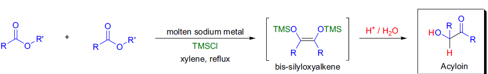 偶姻缩合通过将脂肪族酯与熔融的高度分散钠在热二甲苯中反应,制得醯醇(α-羟基酮)。8 所得的二钠醯醇衍生物经酸化后释放相应的醯醇,这些化合物是有价值的合成中间体。 脂肪族单酯给出对称化合物,而二酯则生成环状醯醇。分子内偶姻缩合是闭合10个以上环(可合成最多34个成员环)的最佳方法之一。6 对于芳香族醯醇(R=Ar)的制备,使用两种芳香醛之间的苯偶姻缩合。 由于醯醇及其阴离子易于被氧化,因此偶姻缩合在惰性气氛中进行。 对于小环(环的大小:4-6),在TMSCl存在下且使用超声波时,产率大大提高。11,13 加入TMSCl通过防止碱催化的副反应(如β-消除、Claisen或Dieckmann缩合),扩大了该反应的适用范围。 所得的双硅氧烯烃可被分离或通过简单的水解或醇解转化为醯醇。