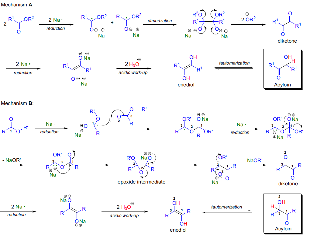 在机理A中,钠通过单电子转移(SET)过程与酯反应,生成自由基阴离子物种, 该物种可以二聚形成二烷氧二阴离子。5,6 消除两个烷氧阴离子后得到二酮。 进一步还原(钠金属向二酮转移电子)产生新的二阴离子,酸性处理后生成烯二醇, 随后互变异构为醯醇。 在机理B中,提出了环氧化物中间体的可能性。23