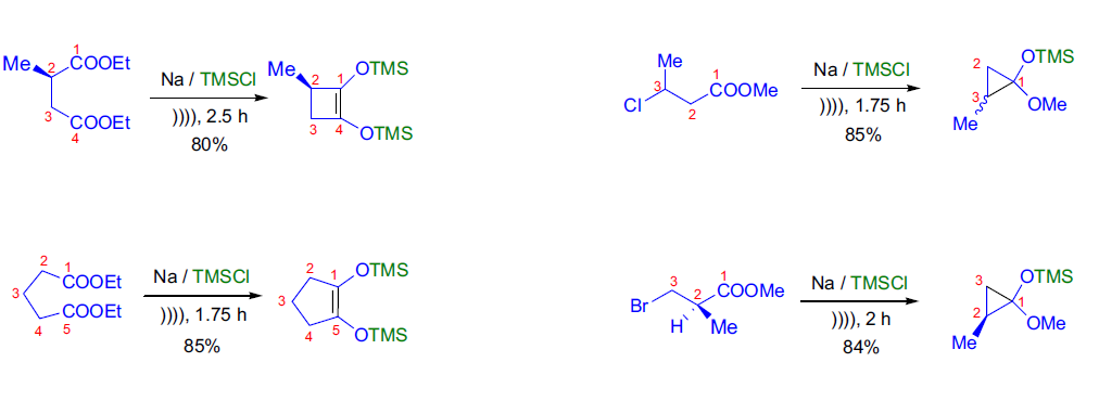 J. Salaün等人研究了超声促进的偶姻缩合和羧酸酯的环化反应。13 他们发现,1,4-、1,5-和1,6-二酯的醯醇耦合反应生成了4、5和6元环产物。 在TMSCl存在下,β-氯代酯的环化反应生成3元环产物,该反应之前需要高度分散的钠, 而在声化学激活下得到简化和改进。
