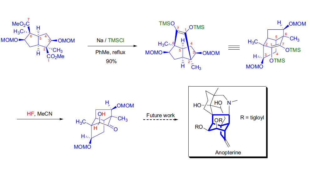 - 二萜生物碱 Anopterus属植物的二萜生物碱,其中主要成分是anopterine(R=tigloyl),具有较高的抗肿瘤活性。 所有这些生物碱都含有三环[3.3.21,4.0]癸烷的子结构。 S. Sieburth等人利用偶姻缩合作为该三环骨架短合成中的关键步骤。24