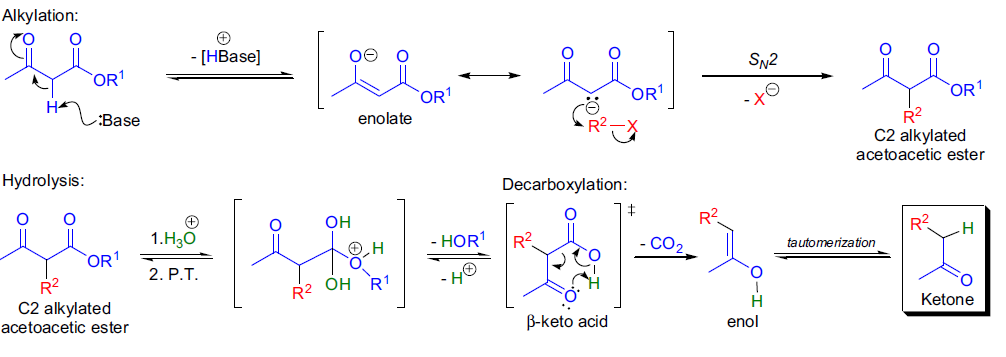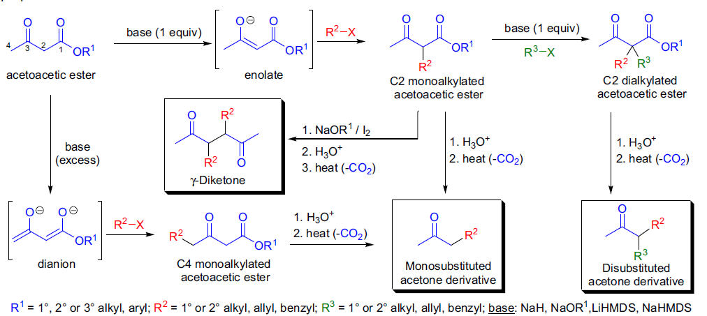 通过 3-氧代丁酸酯(acetoacetic ester, 乙酰乙酸酯)的C-烷基化制备酮类化合物的反应称为乙酰乙酸酯合成。 根据使用的碱量,乙酰乙酸酯可以在C2位置或同时在C2和C4位置去质子化。 C2位置的C-H键受到相邻两个羰基的电子吸引效应活化。这些质子具有相当强的酸性(C2位置的pKa约为11,C4位置的pKa约为24)。在加入一个当量的碱(如醇钠、LDA、NaHMDS或LiHMDS等)时,C2位置优先去质子化,生成的阴离子可以与各种烷基化试剂反应。 通过加入另一个当量的碱(乙醇钠, LDA, NaHMDS 或者 LiHMDS)和烷基化试剂,还可以实现C2的第二次烷基化。 当乙酰乙酸酯与过量的碱反应时,会生成对应的二价阴离子(扩展烯醇盐)。13-15,18,19