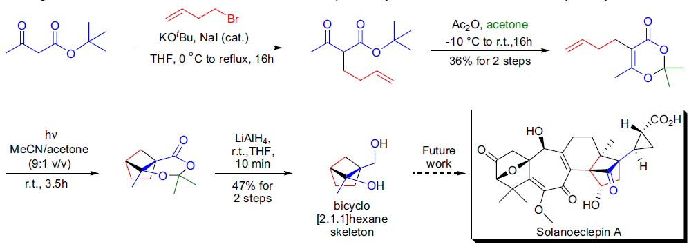 在H. Hiemstra实验室,研究人员利用分子内光化学二噁烯酮-烯烃[2+2]环加成反应合成了solanoeclepin A 的二环[2.1.1]己烷子结构。21