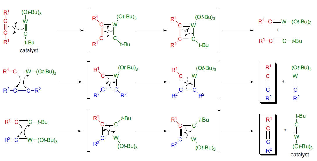 炔烃交叉复分解和复分解聚合可以通过热或光化学方法进行。热激活和光激活体系中催化活性物种的性质尚不清楚。下图所示的机理解释了炔烃交叉复分解产物的形成,但目前提出的机理均缺乏可靠的实验证据支持。