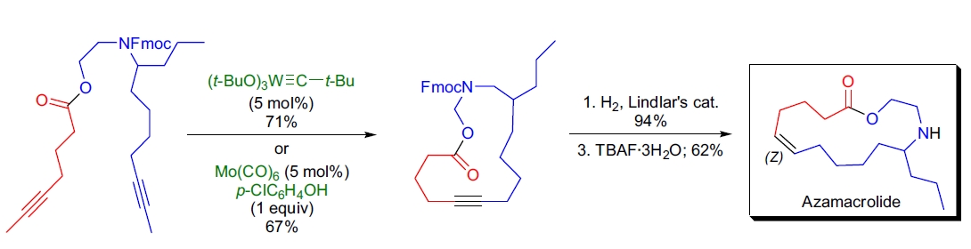 Fürstner的实验室中,环炔复分解(RCAM)的条件得到了开发15。通过RCAM得到的环炔可以通过催化氢化16-18、硼氢化及随后的质子化以及其他方法立体选择性地转化为相应的(Z)-或(E)-烯烃19。在未来几年,炔烃复分解可能会成为有机合成和聚合物合成的有用工具。