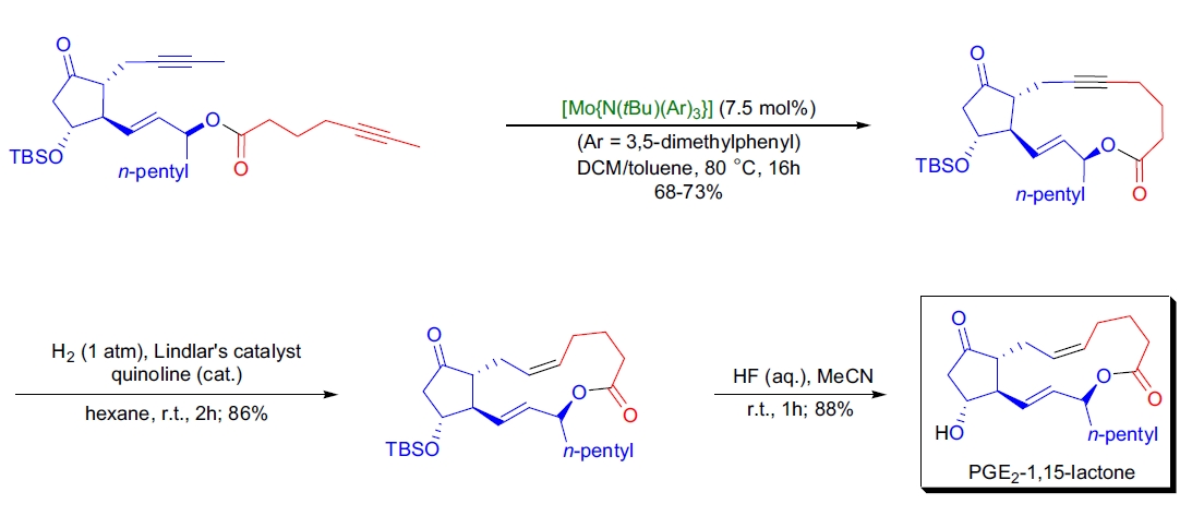A. Fürstner及其同事还表明,RCAM确实是一种非常温和的方法,因为在他们对前列腺素E2-1,15-内酯的立体选择性全合成过程中,Mo[N-(t-Bu)(Ar)3]衍生催化剂耐受预先存在的双键和酮官能团17。对反应混合物的色谱检查表明,在环闭合之前或之后没有发生外消旋化,底物和产物的对映体过量几乎相同。