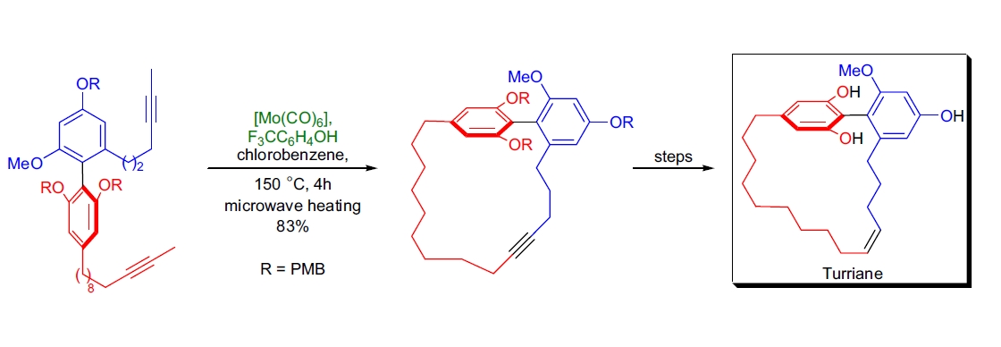 A. Fürstner等人还描述了三种天然存在的环芳烃衍生物(属于turriane类天然产物)的首次全合成28。这些天然产物具有空间阻碍的双芳基部分以及饱和和不饱和的大环系链。使用RCAM后续Lindlar还原这些环炔的立体选择性途径可以进入这一类化合物。