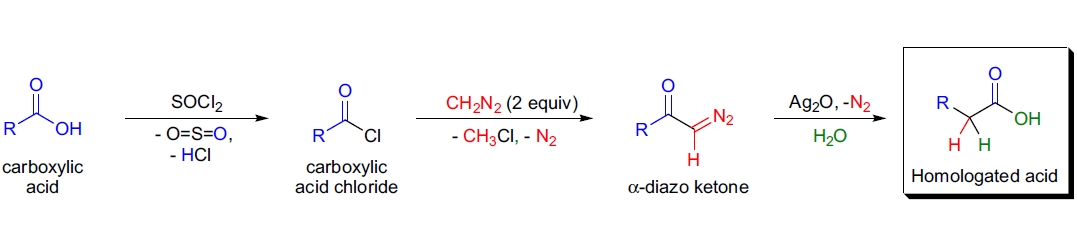 通过三个步骤将羧酸转化为其同系物(比原分子链长一个CH2单元)的过程被称为Arndt-Eistert合成。 这种同系化是延长羧酸碳链的最佳制备方法。