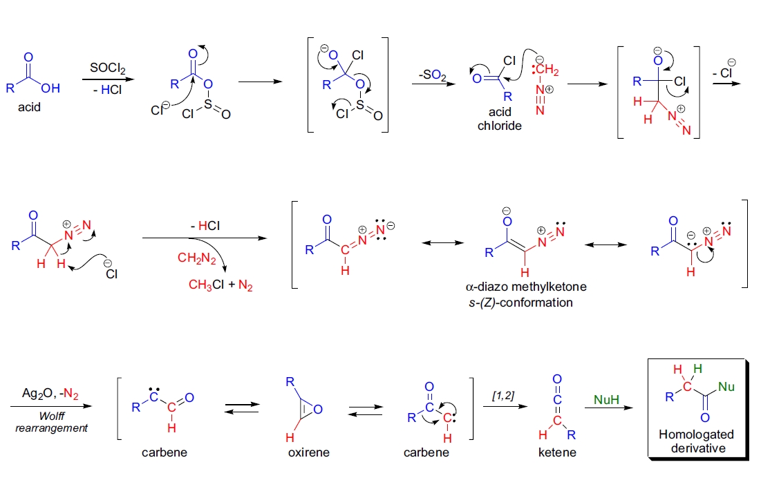 随着一分子氮气的丢失,重氮酮的分解包括形成卡宾,然后卡宾经过卡宾重排生成氧杂环丙烷中间体。卡宾快速发生[1,2]-迁移生成酮烯,酮烯与亲核溶剂反应生成同系酸衍生物。