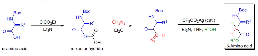与α-肽相比,β-氨基酸的低聚物表现出在溶液和固态中折叠成良好定义的二级结构的显著能力。 在D. Seebach实验室,β-氨基酸的构建模块通过Arndt-Eistert同系化反应从α-氨基酸合成而来12。