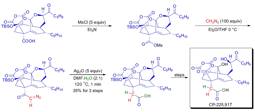 在CP分子全合成过程中,K.C. Nicolaou等人将一个具有位阻的羧酸同系化,这是一个高级中间体的一部分13。 由于该中间体的敏感性,重氮酮是通过酰基甲磺酸酯而非酰氯制备的。然后将重氮酮立即溶解在DMF:H2O(2:1)中,并在过量Ag2O存在下加热至120°C,仅需1分钟即可生成35%收率的同系酸。