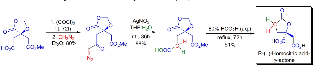 A.T. Russell及其同事从柠檬酸衍生物出发,使用Arndt-Eistert同系化为关键步骤,成功合成了(R)-(-)-同柠檬酸-γ-内酯,达到了克级规模14。