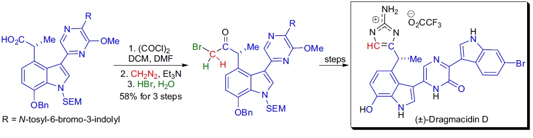 在B.M. Stolz实验室,首次实现了双吲哚生物碱(±)-dragmacidin D的全合成15。 在最终阶段,通过用氢溴酸处理重氮酮中间体,将羧酸同系化为相应的α-溴代酮。
