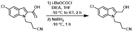 The SM (39.4 g, 149.98 mmol) and DIEA (51.69 mL, 300 mmol) were dissolved in THF (550 mL) and stirred at -10 C under N2. Then a solution of isobutylchloroformate in THF (50 mL) was added dropwise and stirring was continued for 1 h at -10 C, then 1 h at RT. NaBH4 (17.02 g, 450 mmol) was added portionwise at -10 C and stirred for 1 h. H2O (200 mL) was added cautiously to the reaction mixture and stirring was continued for another hour at RT under N2. The mixture was neutralized with 10% citric acid (aq) and then was extracted with EtOAc. The org layer was dried (MgSO4) and concentrated. The residue was purified by silica gel chromatography (50:50:0 to 0:100:0 to 0:99:1 heptane/DCM/MeOH) to provide the product as a white powder. [23.9 g, 64%]