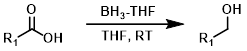 硼烷(BH3)试剂通常能够在酯的存在下选择性还原羧酸。硼烷-四氢呋喃(BH3-THF)的分解会生成氢气(H2)和三丁基硼酸酯。建议BH3-THF在低于35°C的条件下使用(出于安全考虑)。BH3-THF通常仅以1 M的浓度供应。[2][3][4]