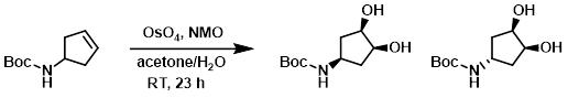 Upjohn二羟基化于1973年提出,使用OsO4作为二羟基化过程中活性催化剂,同时采用N-甲基吗啉N-氧化物(NMO)作为化学计量氧化剂以再生锇催化剂,从而仅需使用催化量的锇。[2][5] Upjohn方法对邻二醇的转化率较高,并能适用于多种底物。然而,该方法无法对四取代烯烃进行二羟基化。[2] Upjohn条件可用于从烯丙醇合成反式二醇,正如Kishi及其同事所示。[6]