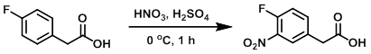 To a solution of the SM (3.0 g, 19.46 mmol) in H2SO4 (20 mL) at 0 C was added dropwise HNO3 (0.913 mL, 20.44 mmol). The reaction was stirred at 0 C for 1 h. The mixture was poured onto ice and extracted with DCM (2x). The combined organics were washed with brine, dried (MgSO4), and concentrated to provide the product. [3.48 g, 90%]