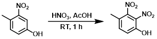 芳香化合物的典型硝化反应依赖于一种称为“混酸”的试剂,即浓硝酸和硫酸的混合物。 这种混酸生成硝酰阳离子(NO2+),这是芳香硝化反应中的活性物质。这种活性成分可以被分离,例如硝酰四氟硼酸盐(NO2+ BF4−)的情况下, 也可以在没有混酸的情况下进行硝化反应。在混酸合成中,硫酸不被消耗,因此既作为催化剂又作为水的吸收剂。在苯的硝化反应中,通常在不超过50°C的温和温度下进行。 该过程是亲电芳香取代反应的一个例子,涉及电子丰富的苯环的进攻: